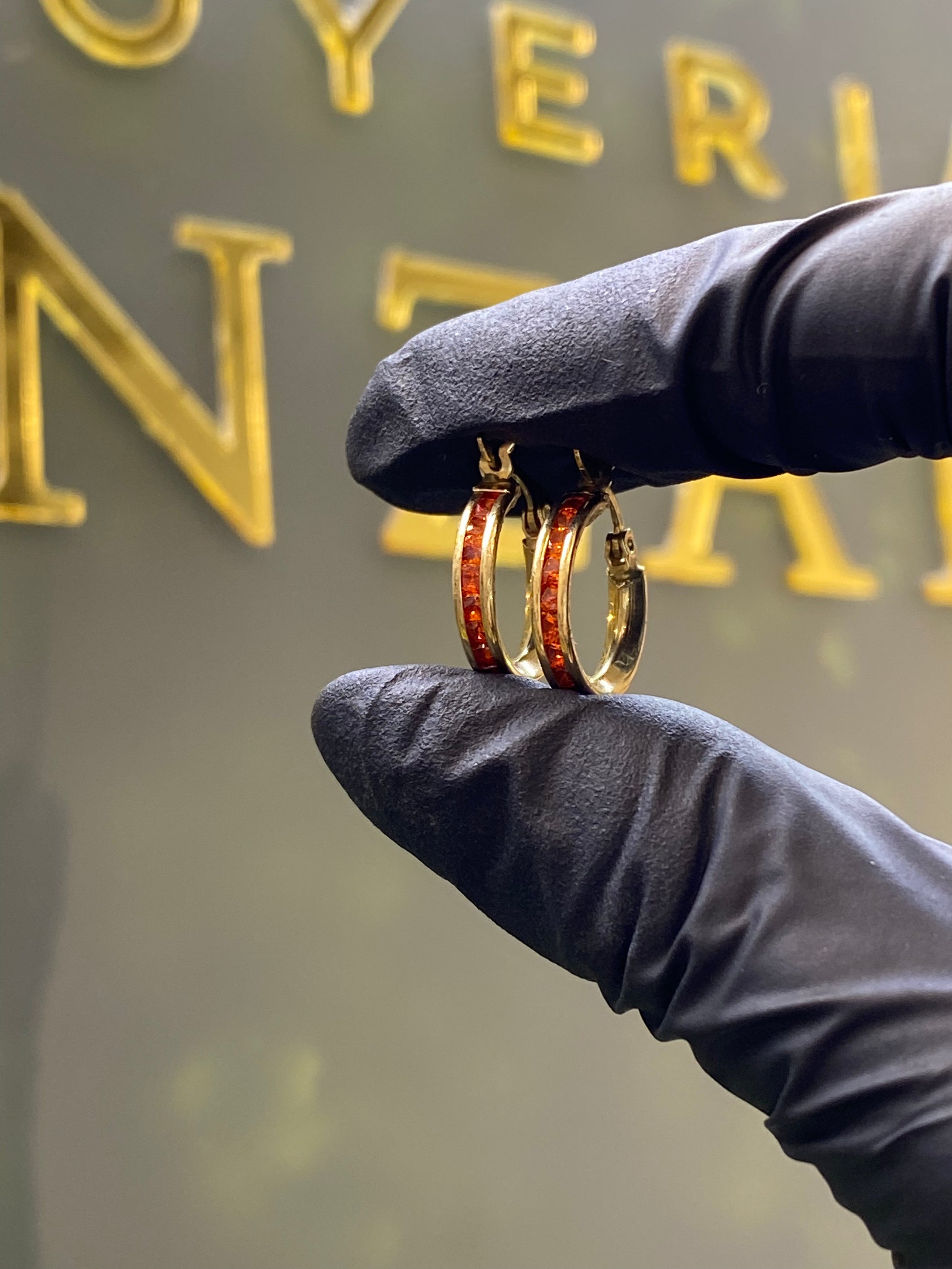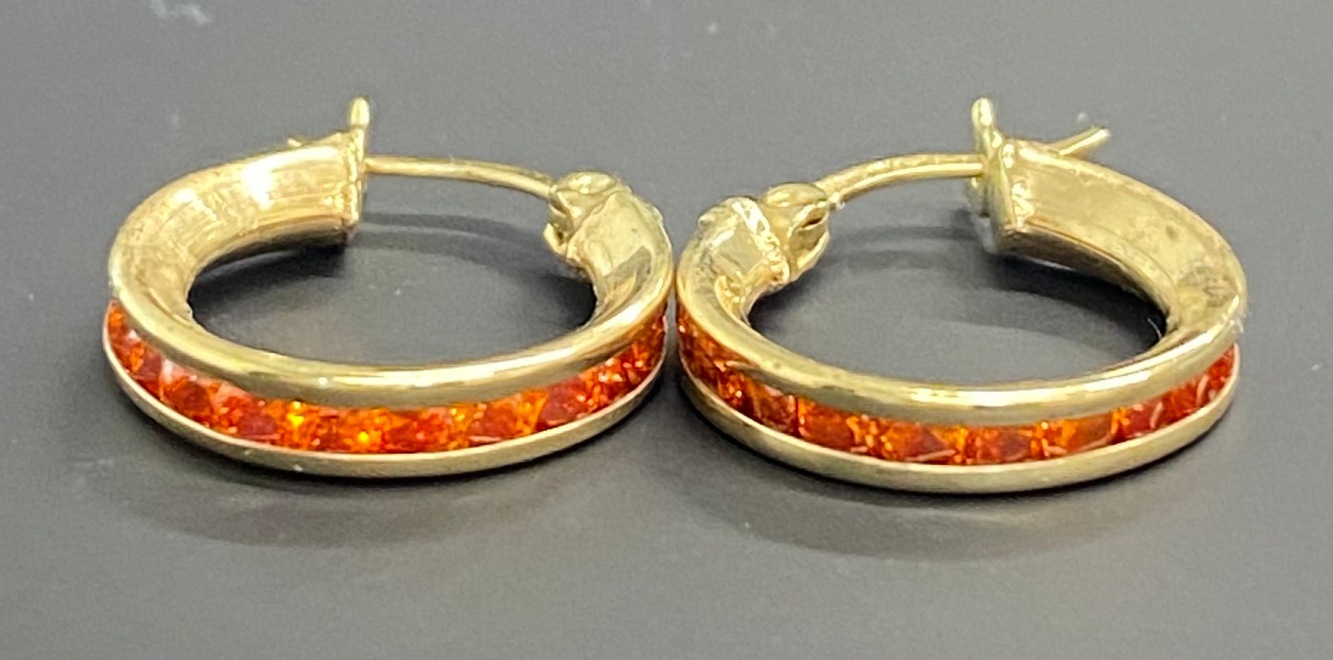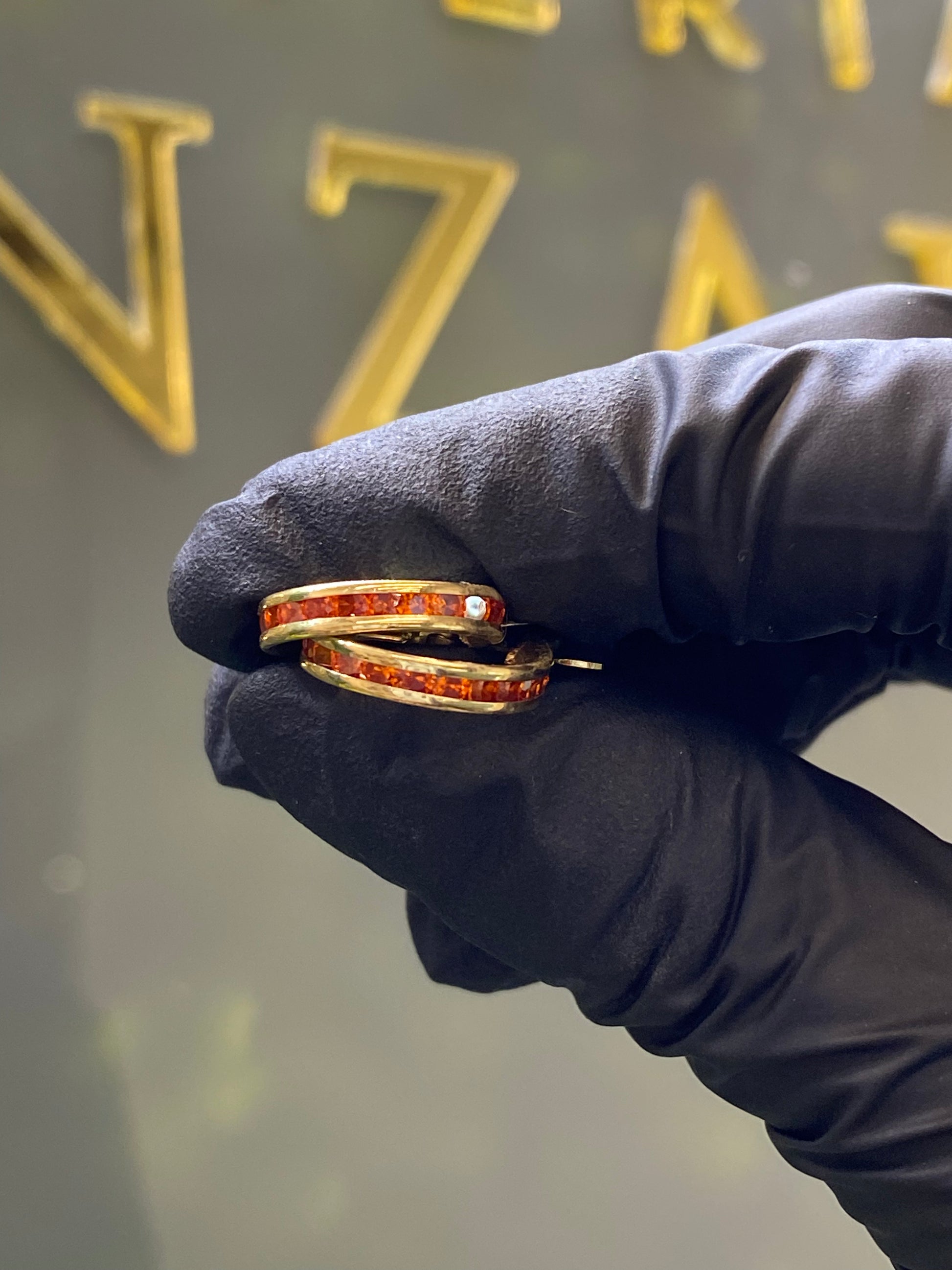 Arracadas de oro amarillo 10k, con un peso aproximado de 1.5 gramos, cuenta con circonias anaranjadas.