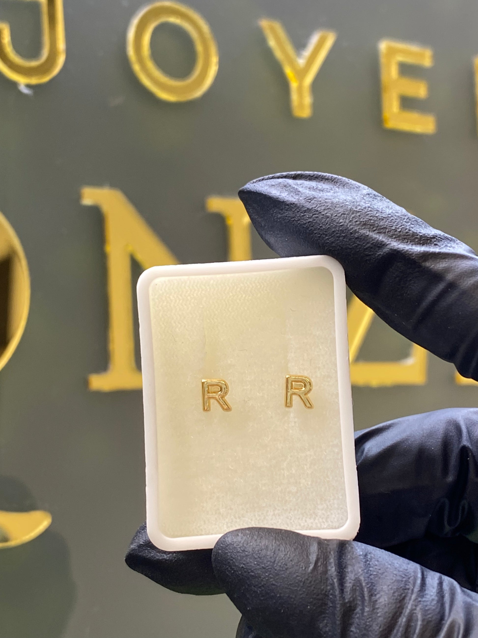 Broquel de oro amarillo 10k, inicial letra R, tiene bolita de rosca por atrás.
