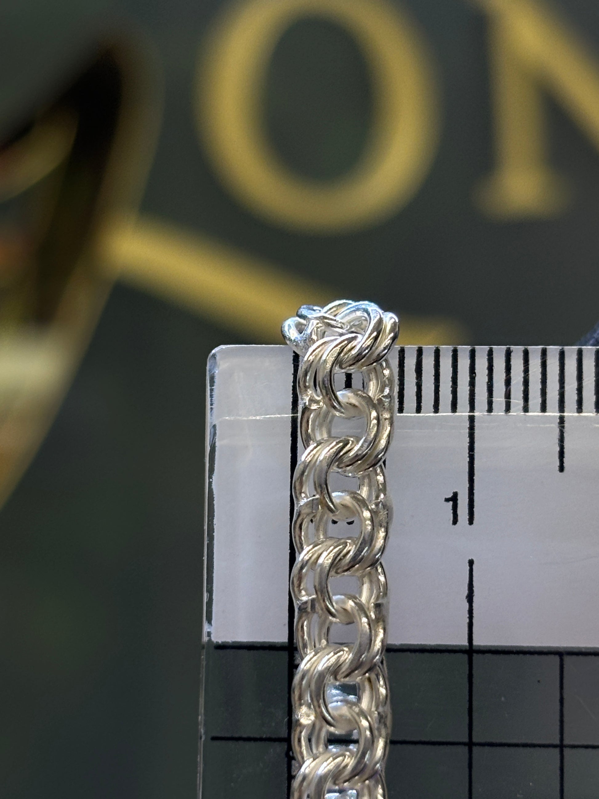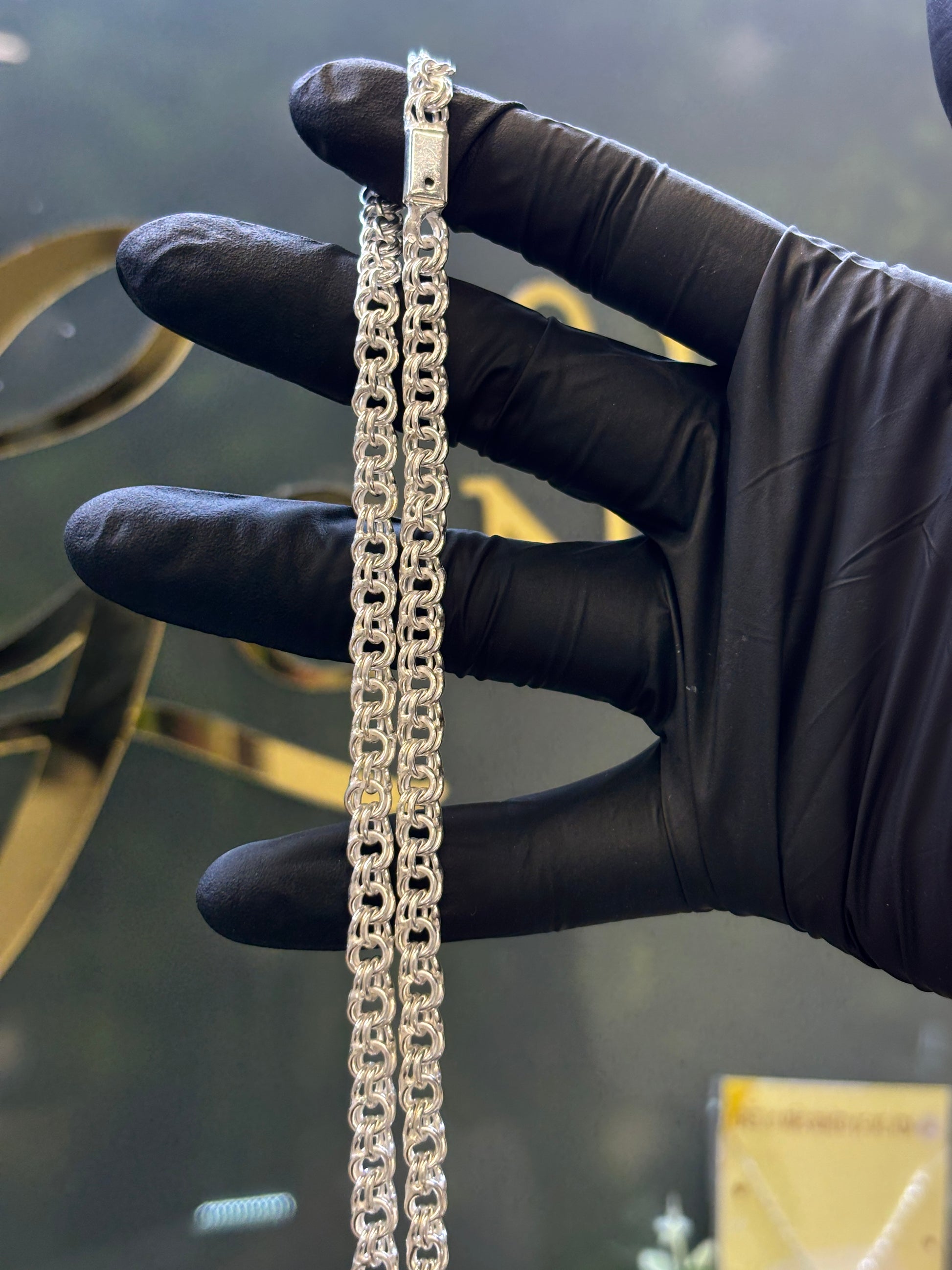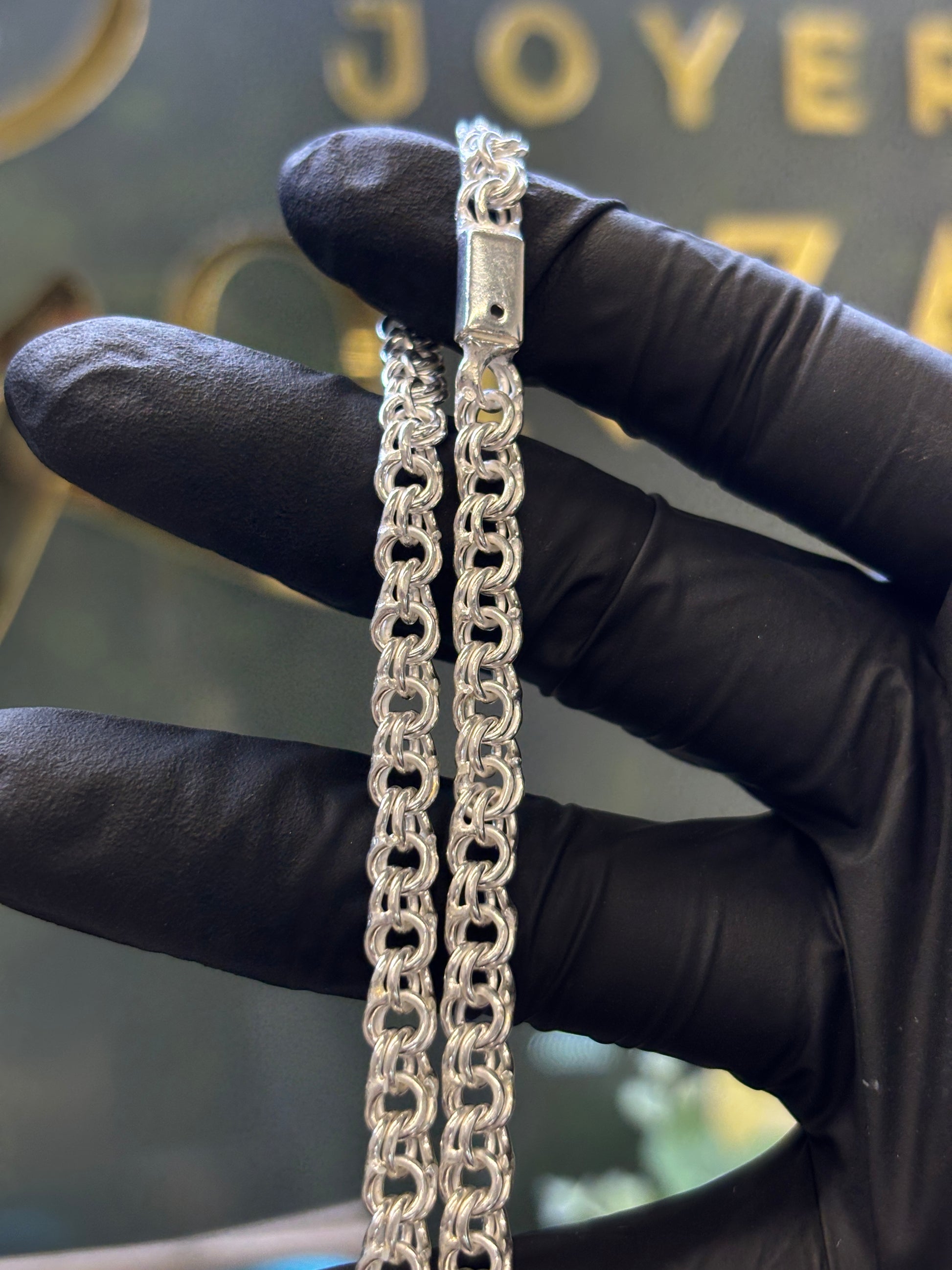 Cadena plata tejido chino con un largo de 45cm (abierta), un ancho de 5.5mm y un peso aproximado de 24.6 gramos