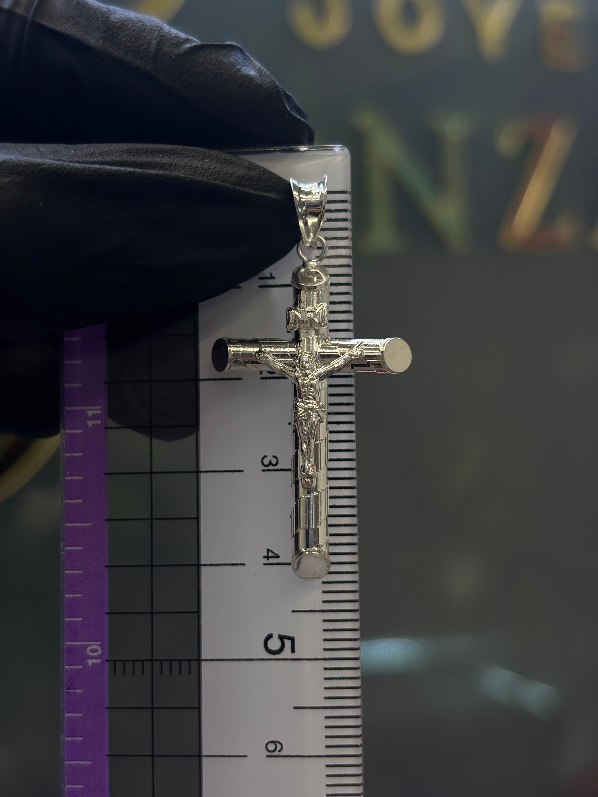 Cruz de plata ley 925 de 4.3cm de alto con reaza y un peso aproximado de 2.3 gramos