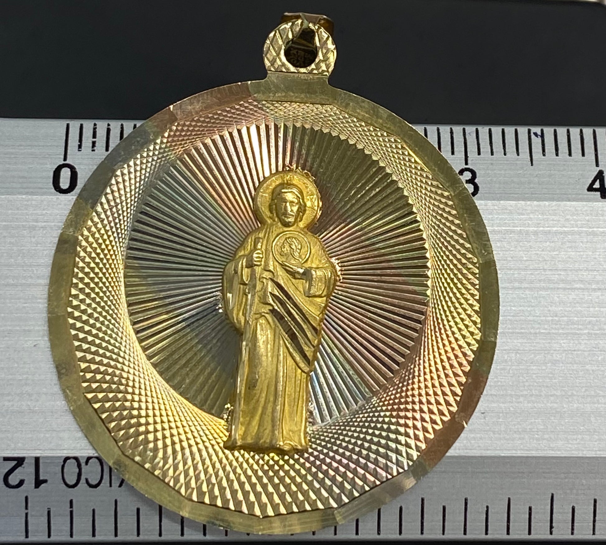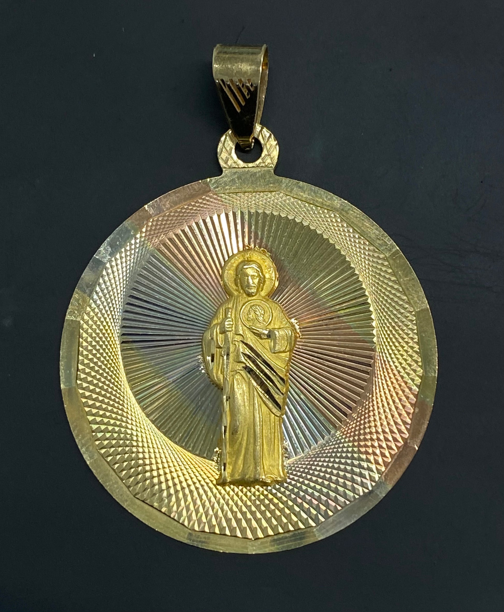 Dije de oro florentino 10k, medalla con combinación de oro blanco, amarillo y rosado, cuenta con diseño de San Judas Tadeo.